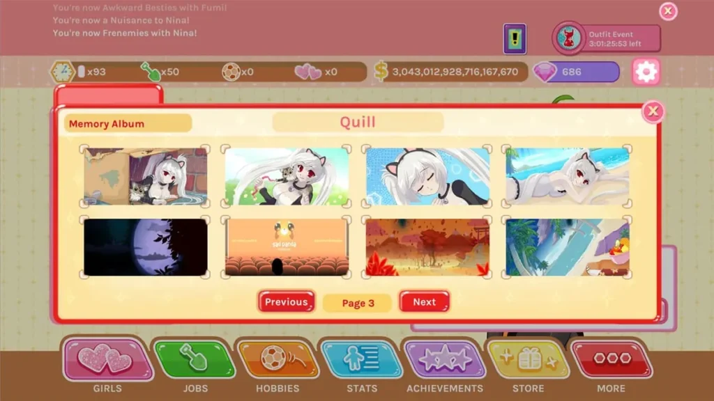 Speaking of girls, the dating system is where the sim part shines. Each character has an affection meter that progresses from Stranger to Acquaintance, Friend, Crush, and finally, Lover. You increase it by giving gifts, going on dates (which cost time), and completing their unique tasks. It’s a playful parody of dating where you learn that buying a girl 100 laptops is a totally valid courtship strategy.
